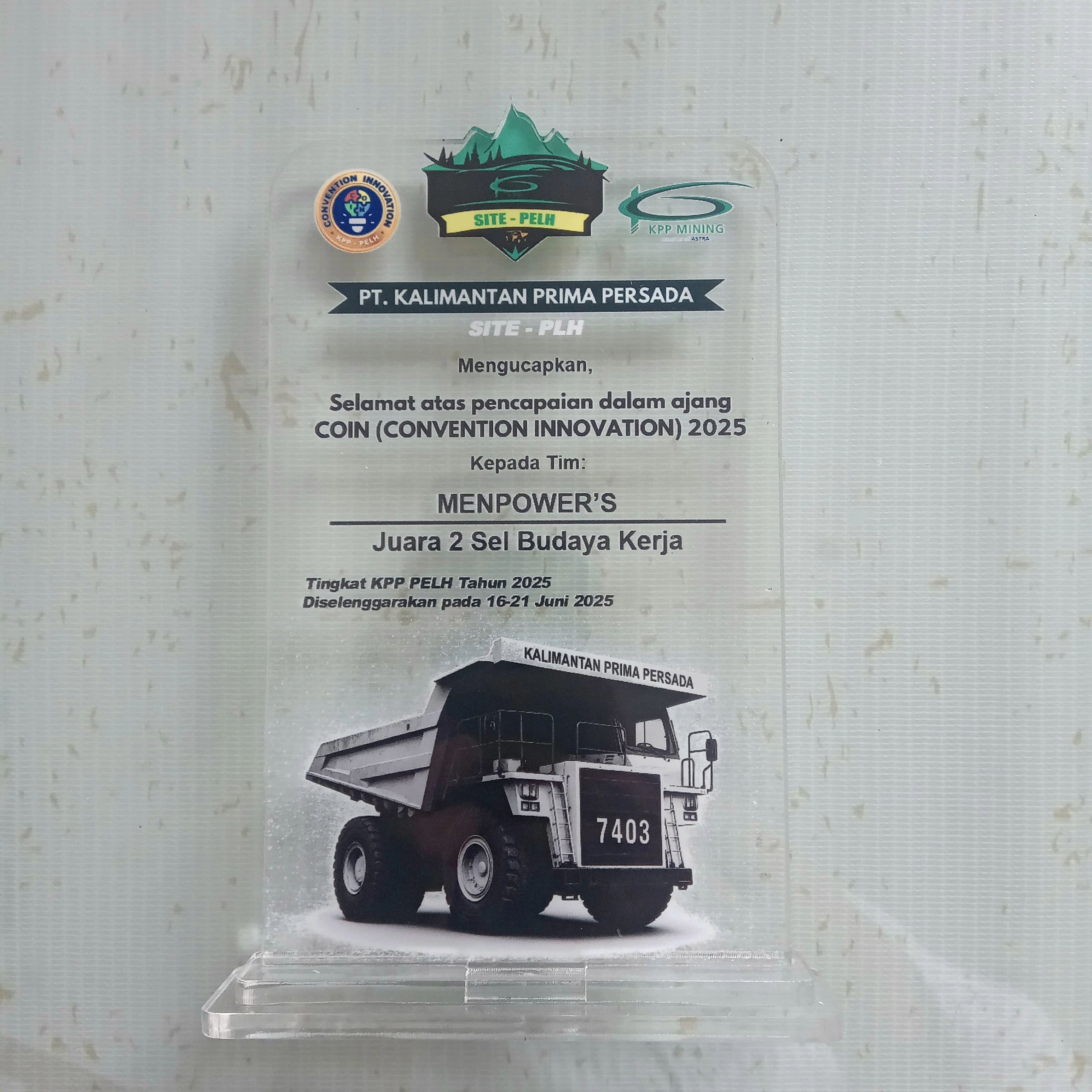 An exclusive acrylic plaque designed as a symbol of appreciation for the team's achievements in the COIN (Convention Innovation) 2025 event. This plaque is made of high-quality clear acrylic material, giving a modern, professional, and elegant impression. The uniqueness of this plaque lies in the illustration of a large mining vehicle printed at the bottom, representing the mining industry as the company's main business field. This design strengthens the corporate identity while giving an exclusive impression to the award moment.