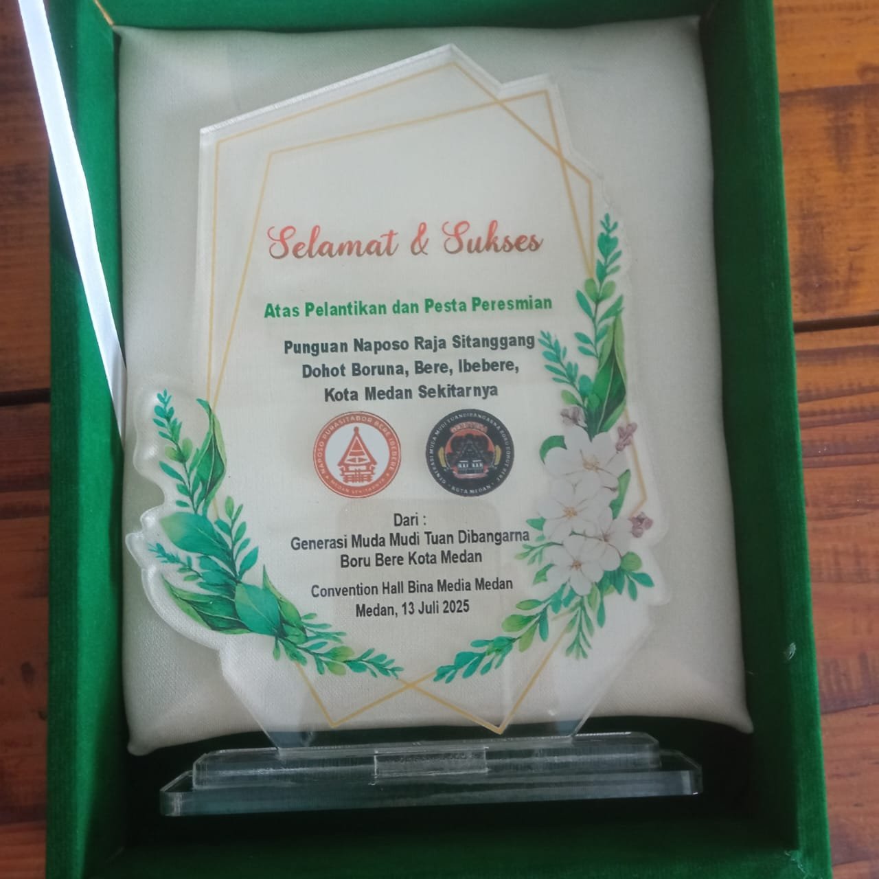 This transparent crystal plaque is neatly arranged in a green velvet box lined with white satin, giving it an exclusive and sacred feel. The plaque's design combines modern geometric shapes with touches of floral ornamentation—green leaves and white flowers—symbolizing growth, honor, and the sanctity of the tradition