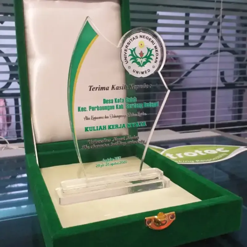 This elegant, custom-shaped acrylic plaque serves as a formal token of Gratitude and Thanks. It is presented by the students of Universitas Negeri Medan (UNIMED) to Desa Kota Galuh, Perbaungan, Serdang Bedagai Regency, acknowledging their cooperation and support during the Student Community Service (Kuliah Kerja Nyata - KKN) program. The design features the UNIMED official crest and a stylized green and yellow curving graphic which embodies the university's branding. This premium keepsake is beautifully displayed within a luxurious dark green velvet box, ensuring an exclusive and professional presentation suitable for commemorating university-community partnerships.