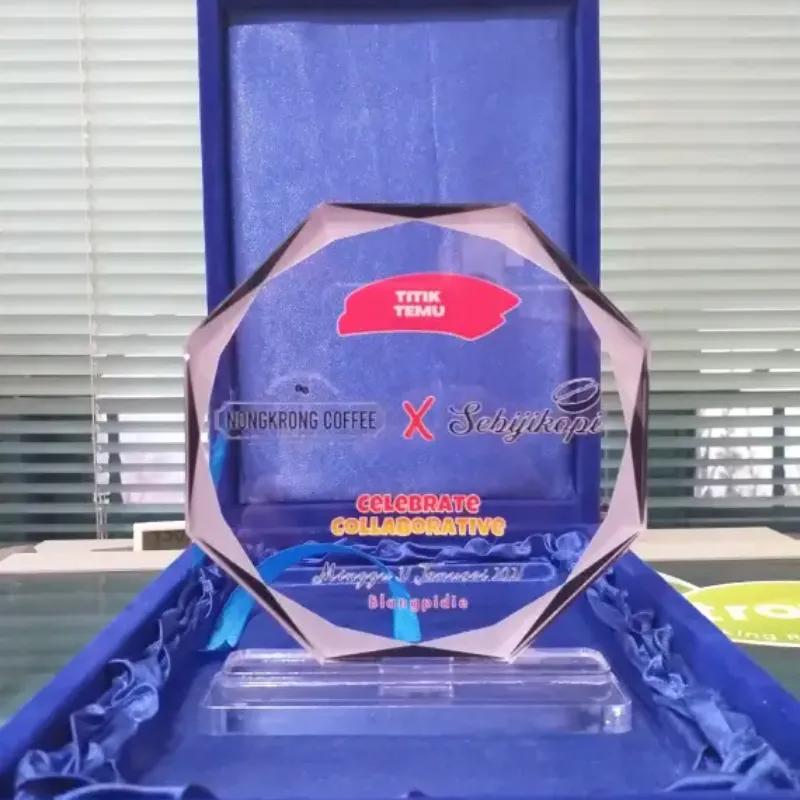 A premium acrylic plaque designed to commemorate special partnerships and collaborations. The octagonal shape gives it a modern and elegant look, while the front is printed with colorful brand logos and celebration text. Perfect as a souvenir or recognition award for business events, partnerships, or corporate milestones. Packaged in an exclusive royal blue velvet box for a professional finish.