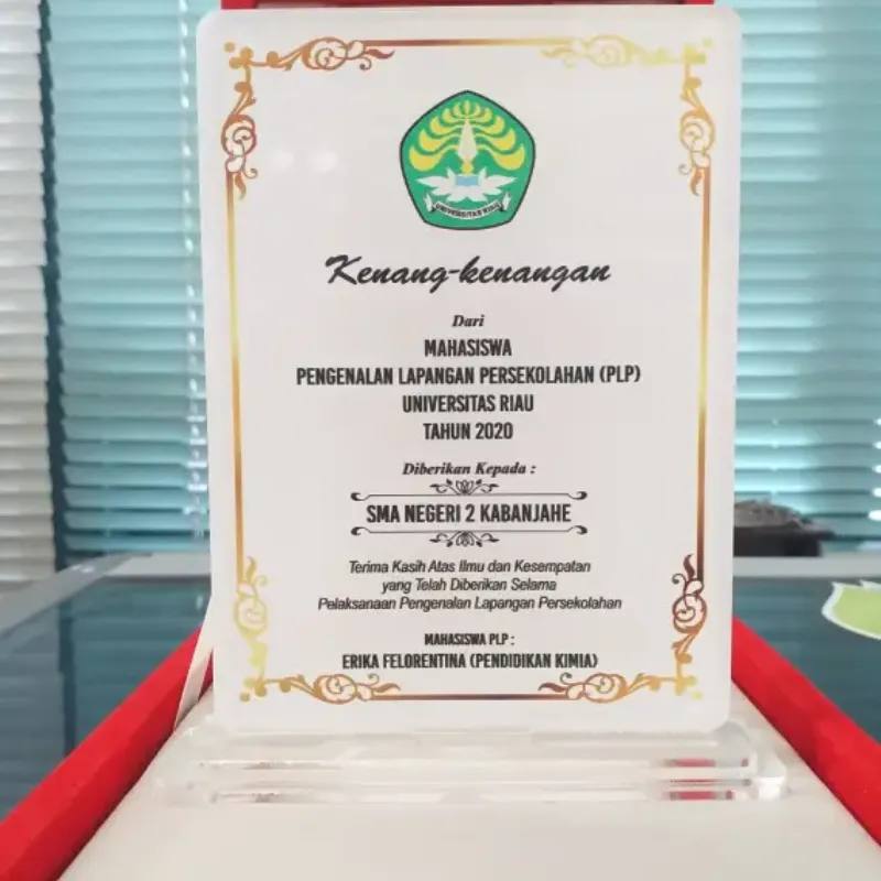 A rectangular acrylic plaque designed as a commemorative gift from Universitas Riau students during the School Field Practice (PLP) program. Featuring an elegant printed institutional logo, gold corner ornaments, and engraved black text, this plaque is ideal as a formal appreciation gift for schools and educational institutions. It is presented in a red velvet gift box for a professional appearance.