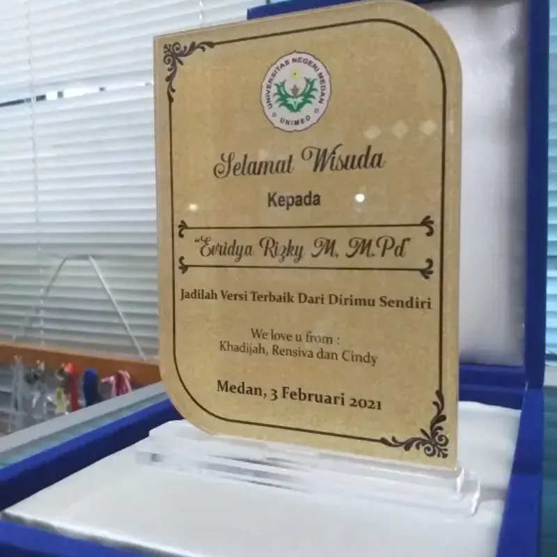 A stylish acrylic plaque presented as a graduation souvenir. The plaque features a beige background with elegant corner ornaments, personalized congratulatory text, and the university logo. It comes in a premium blue velvet gift box, making it a thoughtful and memorable gift for graduates.