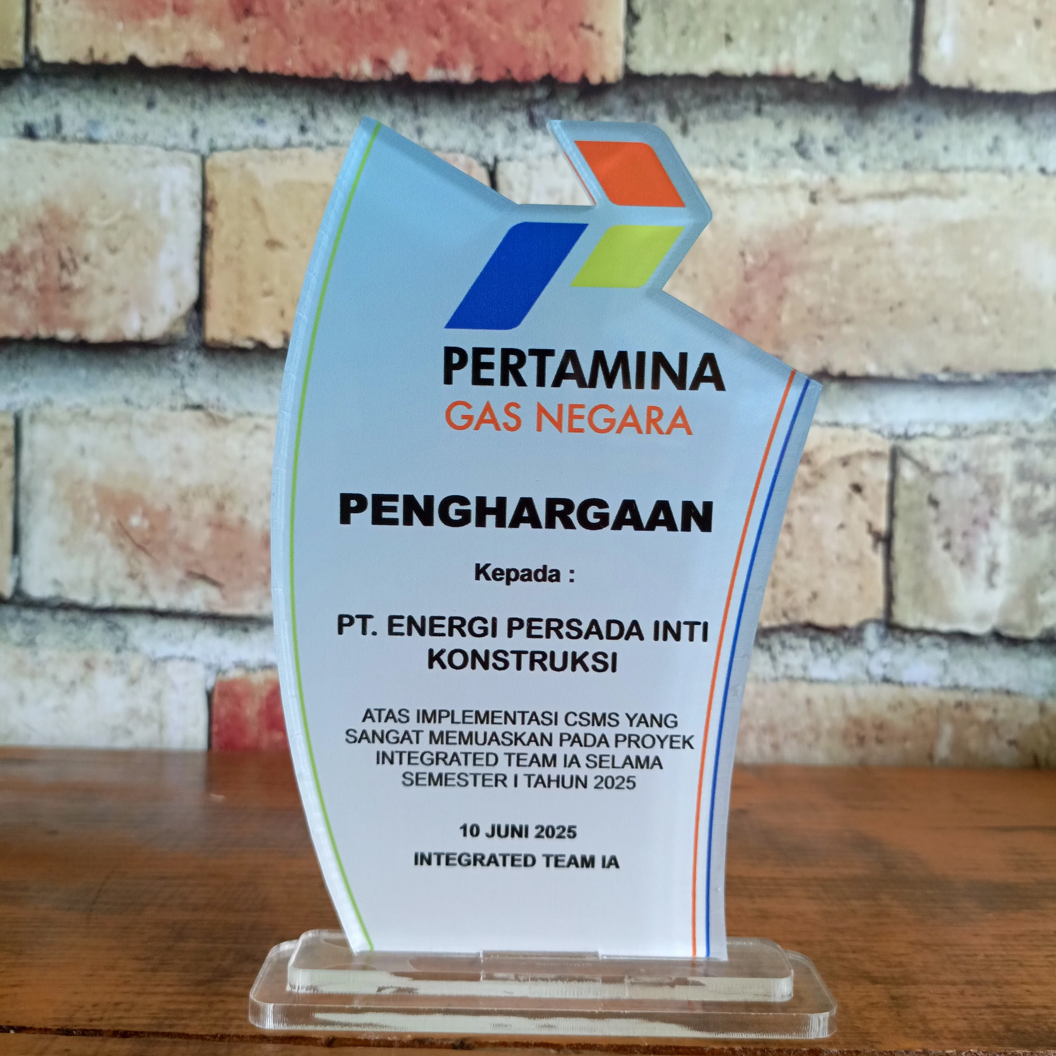 Premium clear acrylic plaque with elegant and modern design, given by Pertamina Gas Negara as a form of appreciation for its partners. This plaque has a unique shape resembling wings or flames that symbolize passion and innovation. The Pertamina colored logo at the top provides a strong corporate identity.