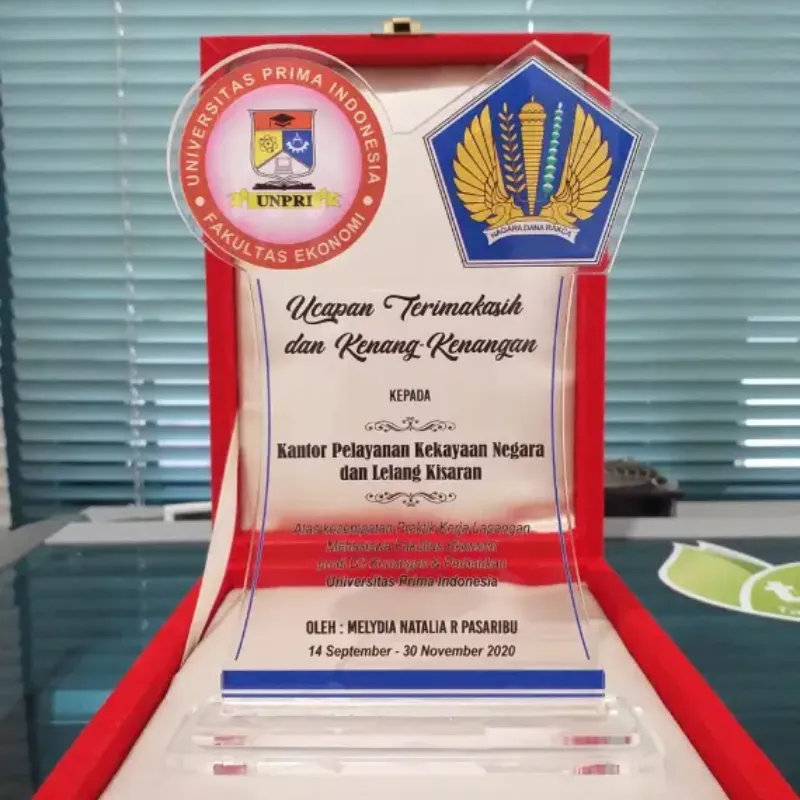 "This elegant acrylic plaque is a token of appreciation and remembrance, presented by Universitas Prima Indonesia – Faculty of Economics to the Office of State Assets and Auction, Kisaran. Designed with a transparent body and dual-logo accents, it symbolizes gratitude and collaboration. Its premium craftsmanship with clear engraving and color printing makes it a meaningful keepsake for institutional recognition. The plaque is beautifully presented in a luxurious red velvet box for an exclusive and professional look."