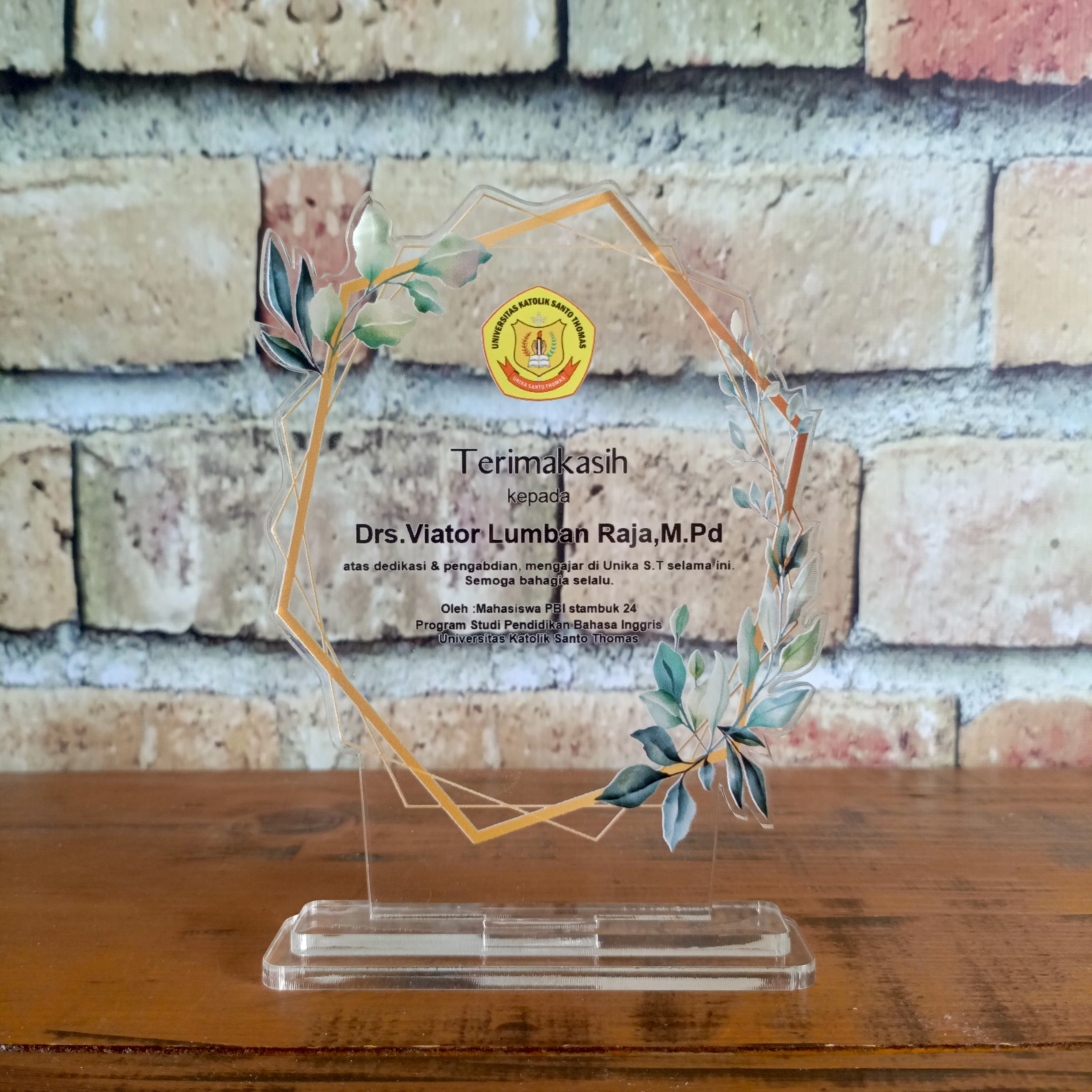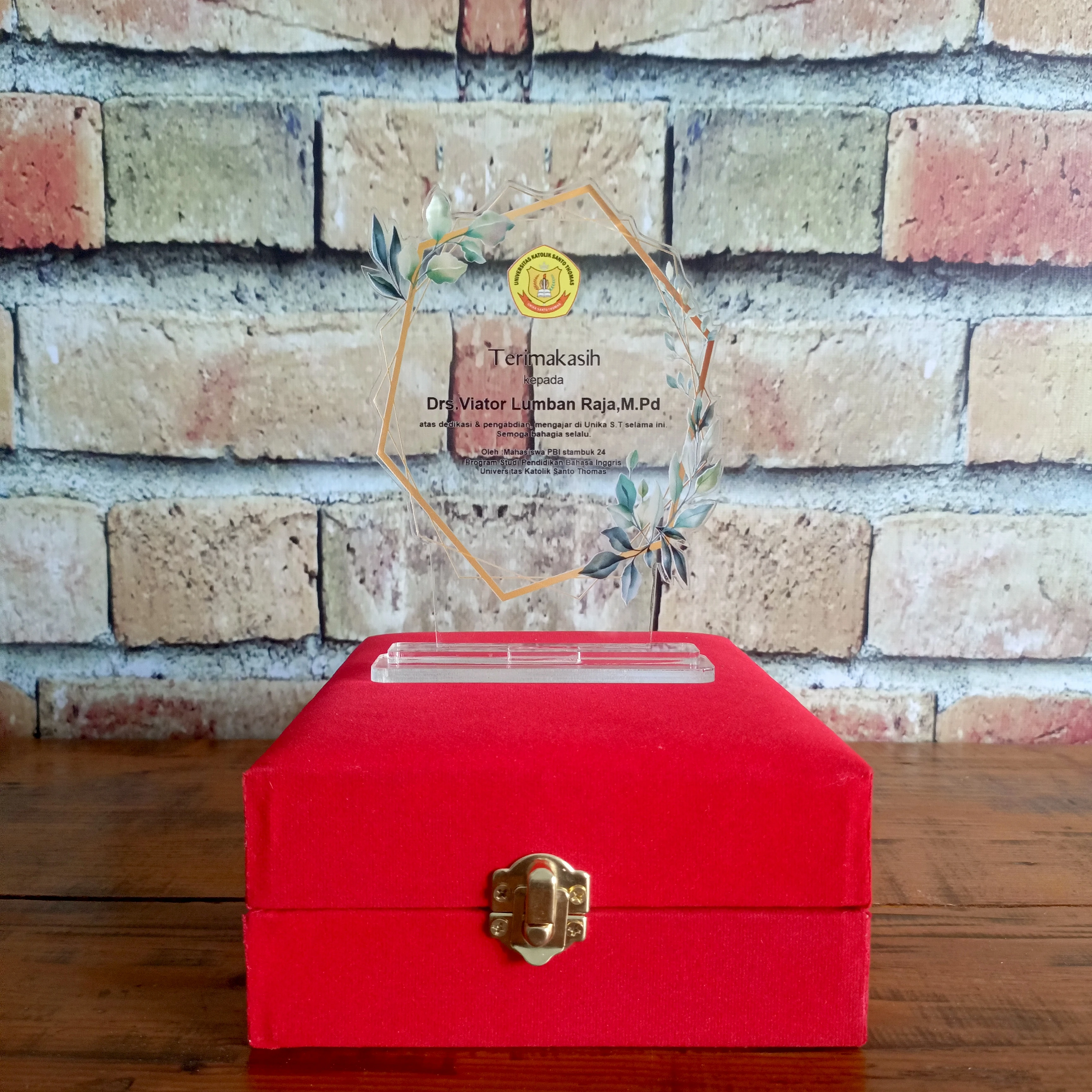 Made of high-quality clear acrylic, this plaque is adorned with elegant floral ornaments framed in gold, adding a warm and classy touch. Packaged in an exclusive red velvet box, this product is perfect for a moment of respect, remembrance, or formal award.