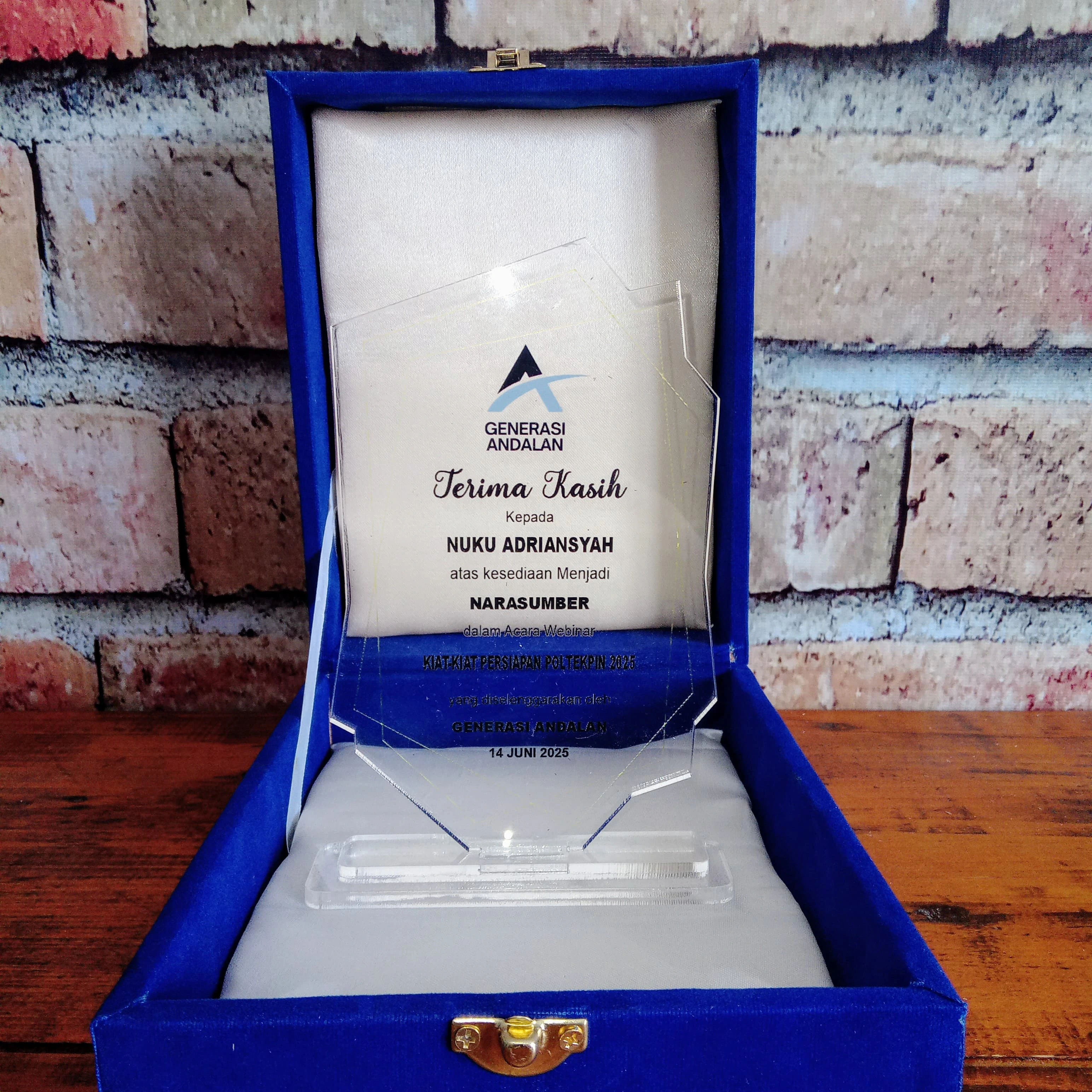 This elegant plaque made of clear acrylic is given as a form of appreciation to the resource person for the webinar themed "Kiat kiat persiapan POLTEKPN 2025". With a modern look and professional print details, this plaque is packaged in a royal blue velvet box that adds a luxurious and formal impression.