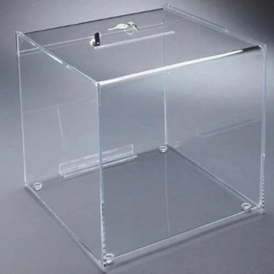 A transparent acrylic box designed for display, storage, or event presentation. Its sturdy construction and clear finish make it ideal for showcasing products, documents, or promotional items.
