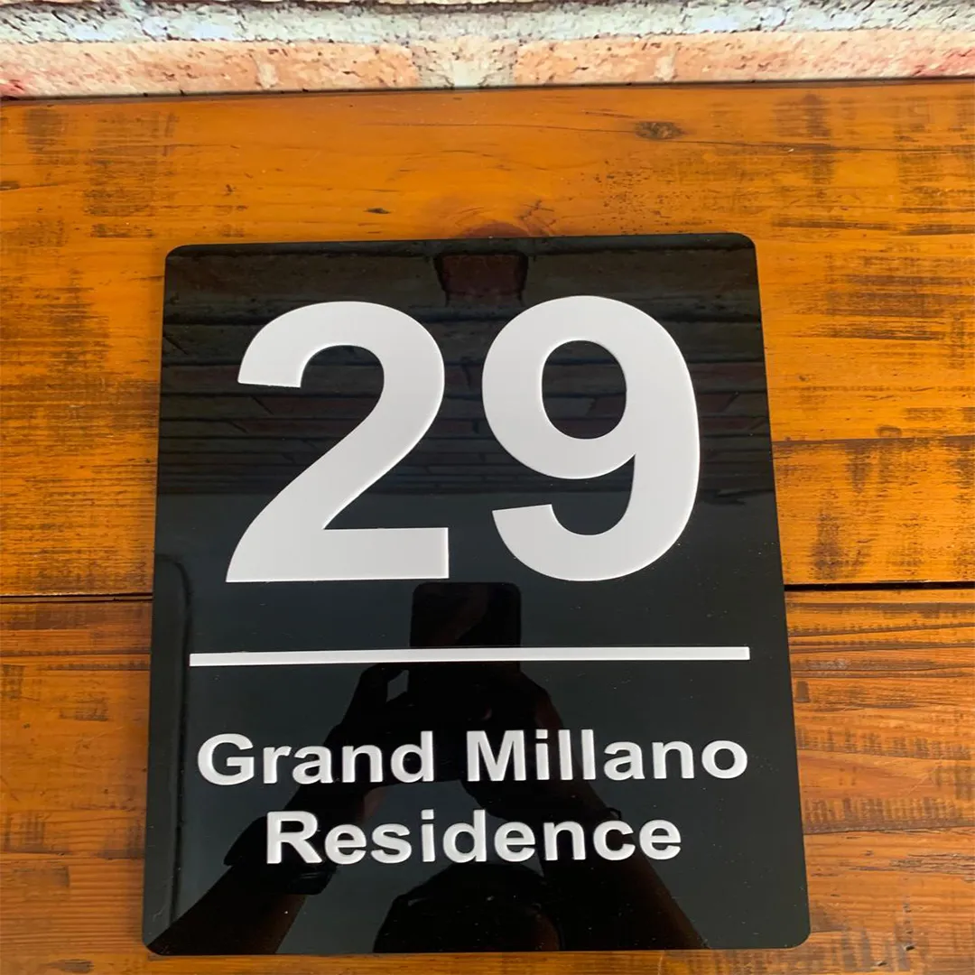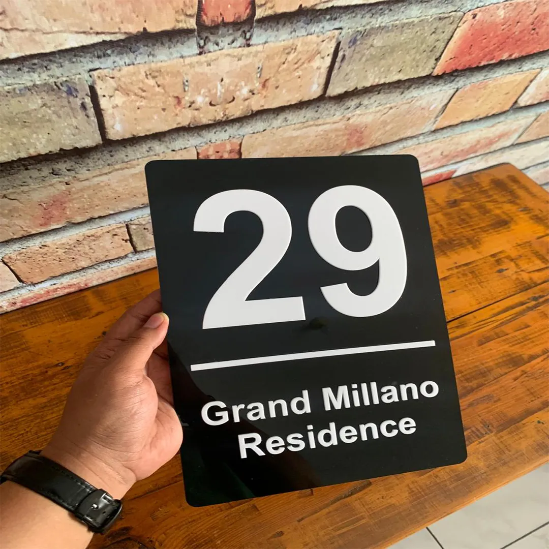 Enhance the elegant look of your home with this exclusive house number plaque. Made from high-quality glossy black acrylic, this plaque features a large, clear “29” and “Grand Millano Residence” lettering at the bottom in easy-to-read contrasting white.