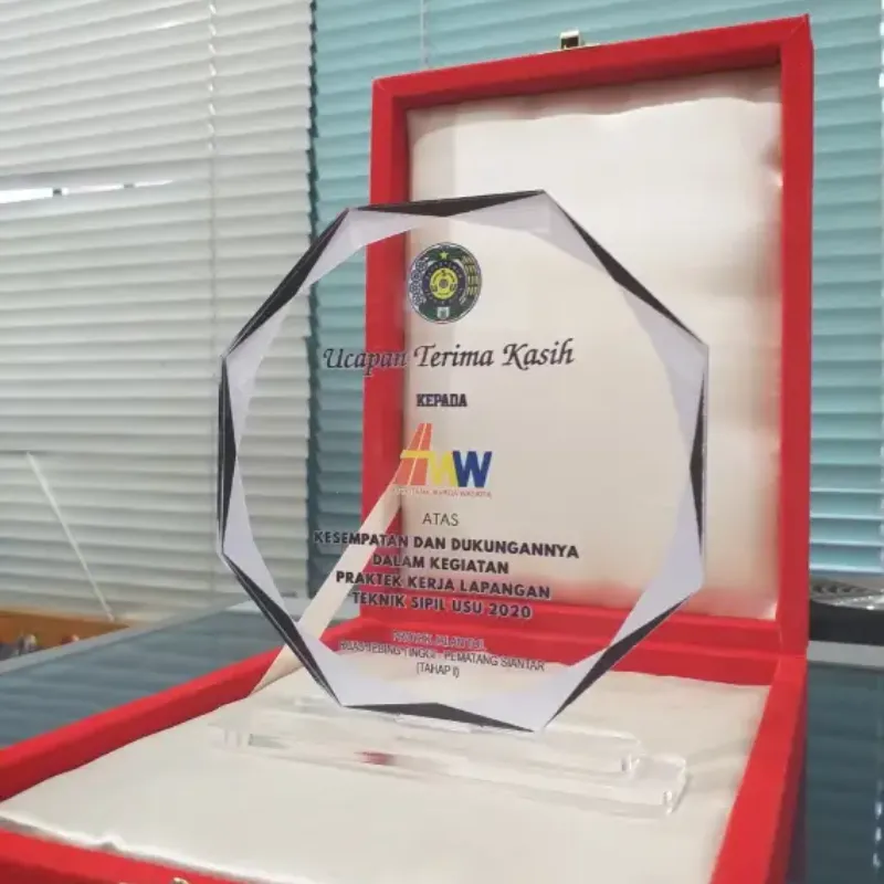 This elegant octagonal acrylic plaque serves as a formal token of Gratitude and Thanks. It is presented in recognition of the opportunity and support provided for the Civil Engineering Field Work Practice (PKL) by Teknik Sipil USU (Universitas Sumatera Utara) in 2020 to PT. Hutama Marga Waskita (HMW), specifically regarding the Tebing Tinggi-Pematang Siantar section (Phase I). Designed with faceted, crystal-like edges and a clear body, it features both the university's and the company's logos. This premium keepsake is beautifully displayed within a luxurious red velvet box, providing an exclusive and highly professional presentation.
