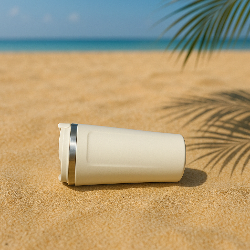 A contemporary tumbler with an LED temperature indicator integrated into the lid. The white finish enhances its sleek design, making it both functional and visually appealing for daily use or promotional purposes.